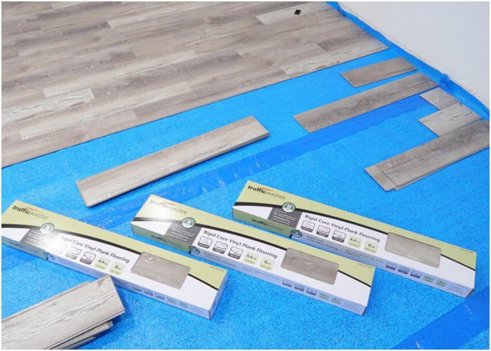 Install the TrafficMaster Rigid Core Click Lock Luxury Vinyl Plank Flooring by starting from the corner of the room. Lay each plank at an angle, slotting the tongue edge into the groove edge of the adjoining plank, then click it into place. Use a rubber mallet and an installation tool to securely join the planks, ensuring there are no gaps. As you proceed, continue to use spacers to maintain the expansion gap. For aesthetic variation and to avoid repetitive patterns, pull planks randomly from at least three different boxes.