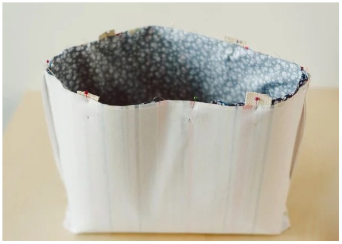 Repeat the previous steps with your inner fabric (the lining), sewing the sides and bottom, and pinching the snipped corners to create a flat base. This will form the interior of your bag, which adds extra durability and a polished finish to the project.
