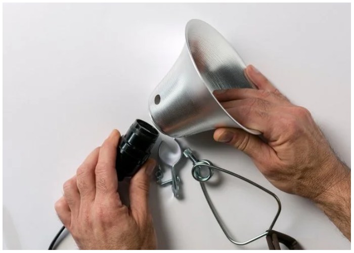 Using an awl, make a hole at the top of the pendant for the electrical cord. Disassemble the light bulb housing from the clamp light and disconnect the wires. Insert the cord through the hole, reconnect the wires, and reassemble the light housing. Once everything is connected, pull the cord tight to position the light bulb inside the pendant. Add an LED light bulb (avoid incandescent bulbs as they generate more heat) and hang your pendant light in its desired location.