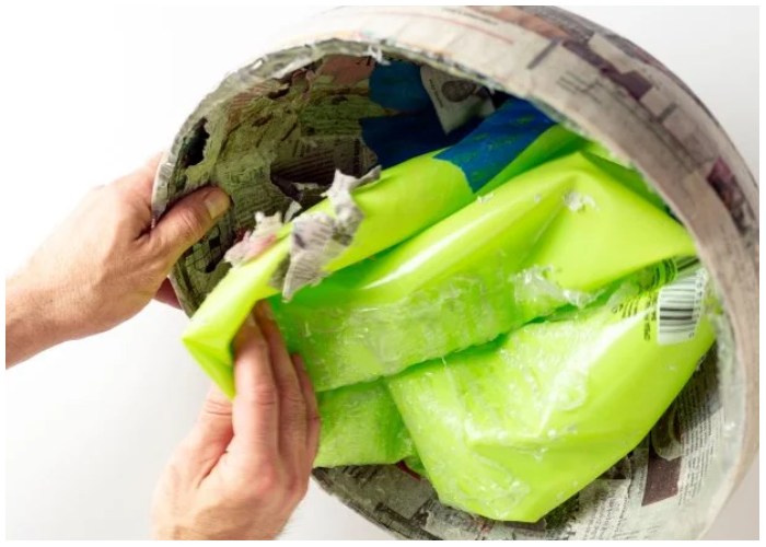 Once the paper mache is dry, carefully pop the play ball with a sharp object and remove it. Smooth any rough edges with sandpaper. Next, spray the inside of the pendant with gold spray paint to give it a luxurious, glowing finish. Apply a second coat if necessary and let it dry. For a more organic look, use scissors to trim the bottom of the pendant in a slight wave pattern.