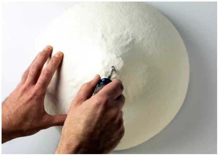 To give the pendant a textured finish, cover the inside with masking tape and paper to protect it while you spray the outside. Coat the exterior with ceiling texture spray, adding a second layer if needed. Once the texture spray has dried, the pendant will have a sophisticated finish that complements the smooth, metallic interior.