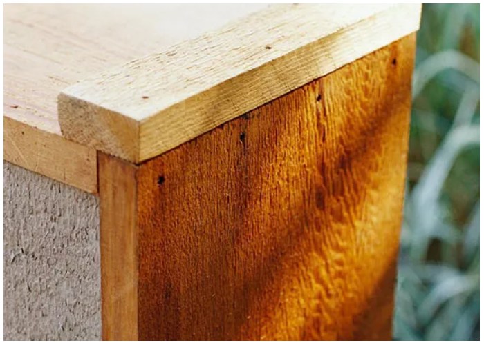 For added strength and durability, cut four pieces of 1×2-inch scrap wood. Apply a water sealant to one side of each piece. Once dry, attach the pieces—sealant side down—into each corner of the box to provide extra support.