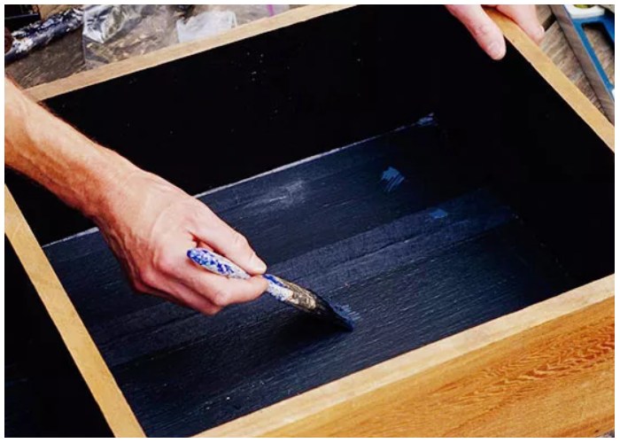 Now it’s time to waterproof your pond box. Inside the box, you can either install a plastic liner or apply a water sealant. Make sure the sealant is safe for aquatic life, as it will come into direct contact with water and plants. Apply an extra coat of sealant on both the pond and planter sides. In the planter section, drill three drainage holes at the bottom.