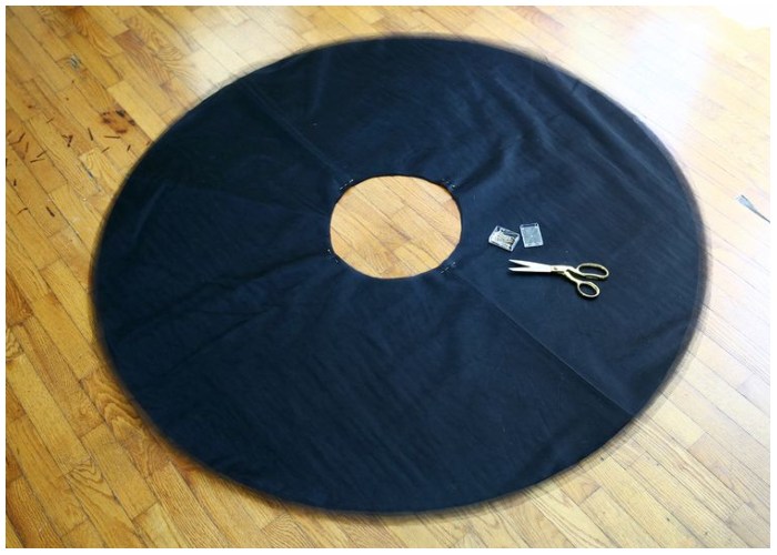 Make as many tulle donuts (layers) as you want, and cut one extra from the lining material for the bottom layer. If hemming your lining, cut it the same size as the tulle so it’s shorter when hemmed. If using a serger or fabric that doesn’t need hemming, cut it shorter to begin with. Stack your layers with the lining as the bottom layer and pin them near the waist to secure.