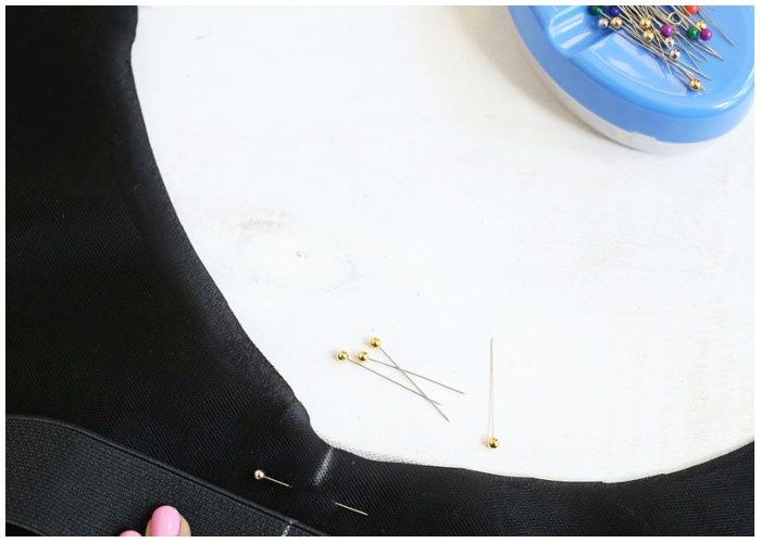 Since the elastic waistline is likely smaller than the fabric opening, pin the middle of each gap to the middle of the elastic section, so you have eight pins holding the layers together.