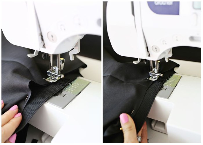 Pin the elastic around your natural waist so it feels snug but not too tight. Wiggle out of the elastic and sew it together at that point. Trim the ends to 1/2” long, fold them down, pin in place, and sew to flatten them.