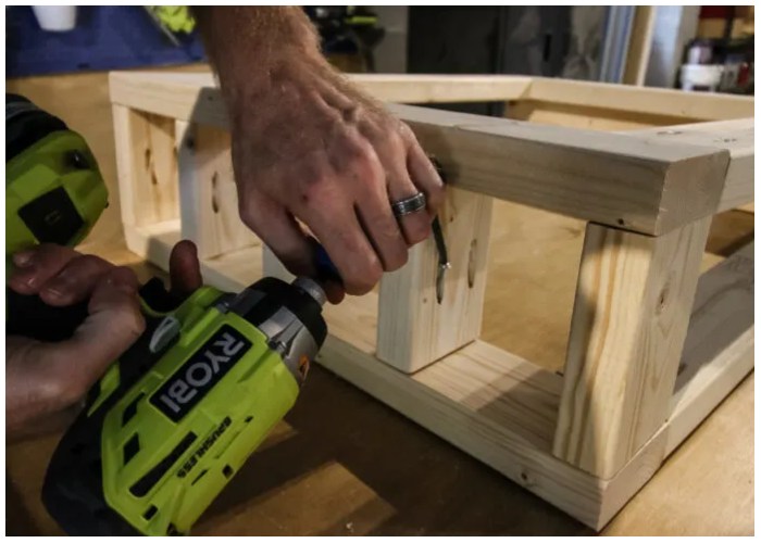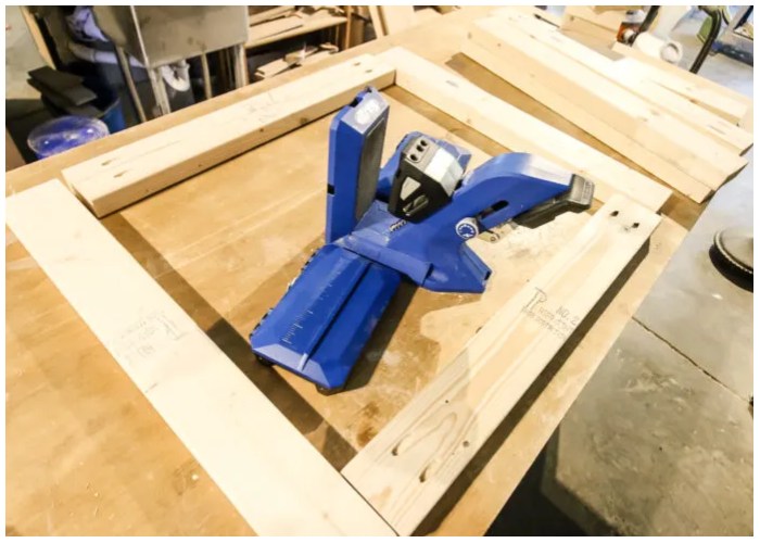 Start by making all the necessary cuts from the 2x4s according to the dimensions provided in the free woodworking plans. These plans will include the exact lengths and angles needed for each piece. Once all the cuts are made, use the Kreg 720 Pro to drill pocket holes in the appropriate locations. The AutoMaxx clamping system on the Kreg 720 makes it quick and easy to swap pieces of wood while drilling.
