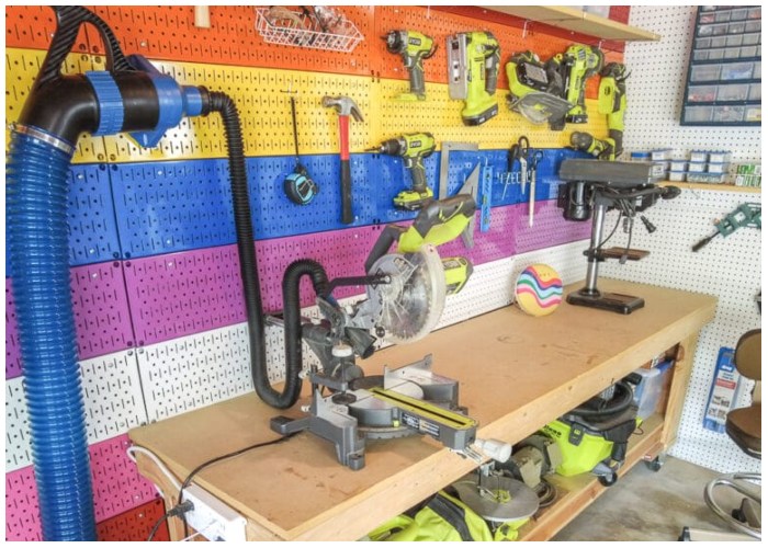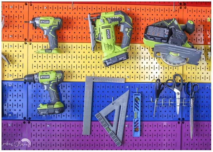 With everything in place, we moved the workbench and tools back into the garage. The organized setup not only looks great but also makes the workspace highly functional. The rainbow pegboard wall adds a touch of creativity and color, making the garage a more enjoyable place to work.
